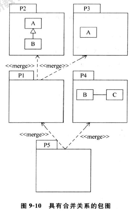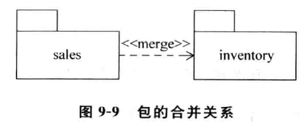 合并关系表示将目标包中的内容合并到源包中去。同样,目标 包 中 的 私 有内容也是不能被合并的。合并关系用<< merge > > 加在虚线上表示,箭头指向被合并的包。如图9-9所示为包 sales合并了包inventory中的元素。