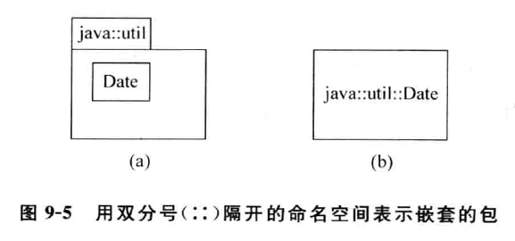 由于用如图 9- 4 所示的形式表示多层的嵌套将很麻烦,因 此 UML 用双分号(:: ::) 隔 开的命名空间的形式表示这种嵌套关系。应用这种方法,图 9- 4 分别与如图 9-5 所示的两种形式等价。