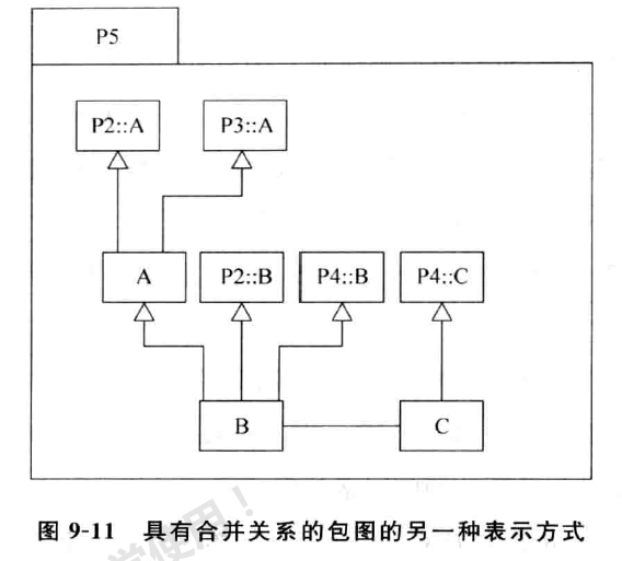 ( 2 ) 如果合并的包中的类与被合并包中的类重名或具有相同的类型,那么在合并后的包中将存在一个泛化关系来建模合并的包与被合并包中的这些类。