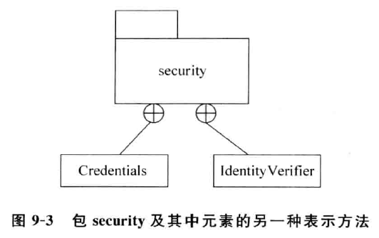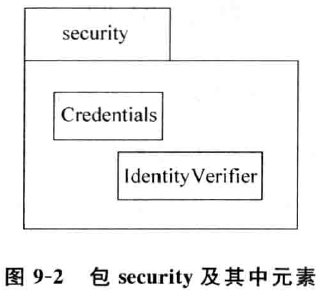 包中元素的表示方式 有两种 。一是在包中用矩形画出这些元素 ,这种方法下 ,包的名称就可以放 在包图左上部的标 签 中。例如,要表示 包 s ec ur it y 中的元素C red ent i als 和 Id ent it y V er i fier ,可以用 如图 9- 2 所示的方式 。