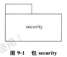 U M L 使用一个左上部带有标签的矩形表示包。图 9-1 表示了包 secur i t y。