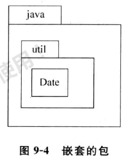 系统自身定义了最外层的命名空间,它是所有名字的基础。它是 一个包,通常还带有几层嵌套的包,直到得 到最终基 本元素的名字为止。也就是说,包还可以 包含其他的包,例如,包ja va 可以包含包ut i l,包ut il 包含类Date 。这种结构可以用如图9-4 所示的形式 表示。