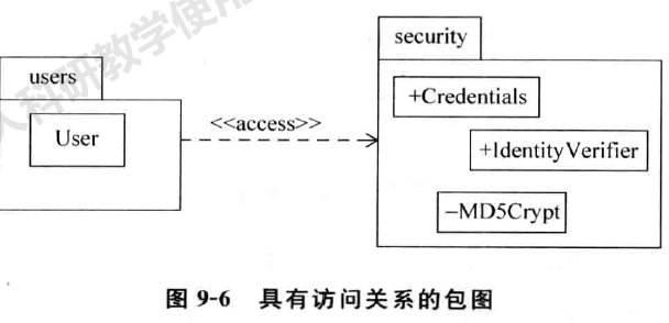 包的访问关系详细地说明了被导人的元素具有私有的可见性。U ML 用构造型< < acc ess> > 加在虚线上表示包之间的访问关系。来看如图9-6所示的例子。