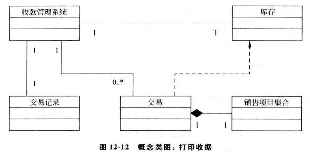 根据“打印收据"的顺序图模型(见图 12-11) ,获得图 12- 12 概 念 类 图 模 型。在图 12- 12 中 ,管理系统还拥有库存和交易记录对象,但是交易与库存是依赖关系,因 为交易对象并不拥有库存对象 ,但是它使用该对象的方法。