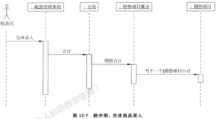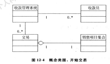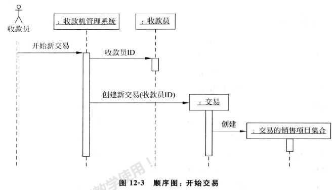 该顺序图模 型(见图12-3) 描述由收款员单击系统界面开始一个新的交易后,所触发的一系列系统行为,首先取得收款员ID(员工编号),然后系统使用该员工编号创建交易对象 ,接下来新 产生的交易对象马上创建一个交易的销售项目集合 对象。这个顺序图模 型实际上对用例进行了系统内部行为的分析 。根据图 12-3顺序图模型的分析,可以看到图 12- 4概念类图模型中对象之间的如下关联: