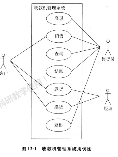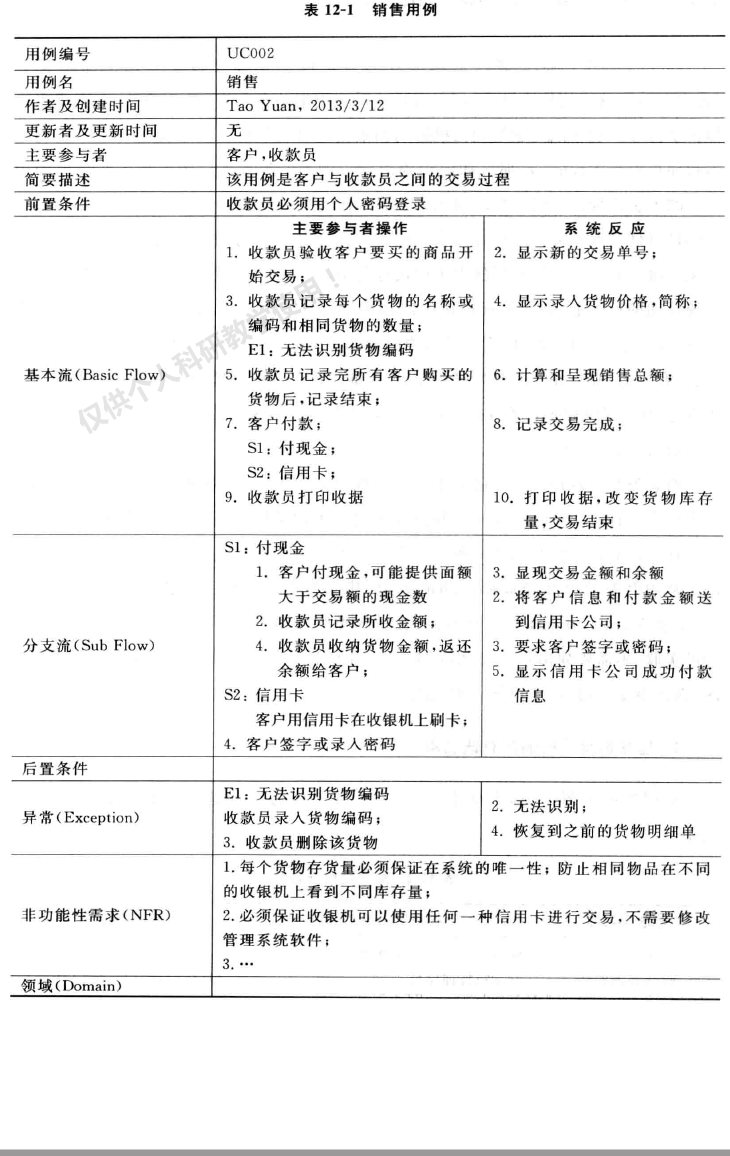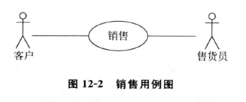 根据收款机管理系统用例图模型中出现的所有用例,选择销售用例作为示范案 例,如图 12- 2 所示。本章的目的是介绍 UML 模型在面向对象分析和设计中的应用, 所以,没有对用例图模型中的所有用例进行规范化描述。描述用例并不属于 UML 建模语言范畴。用例描述属千软件工程需求规范化的知识范畴。为了有效地指导软件 工程师的开发,有必要把客户语言描述的需 求转化为软件工程的规范化语言的描述方式,这 种 规 范的描述方式就是用例。