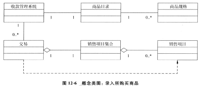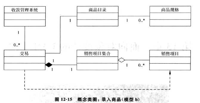 根据“录入商 品” 的顺序图模型(见图12-5 ) ,可以 在图 12- 6 概念类图模型中建立对象之间的如下关联:
