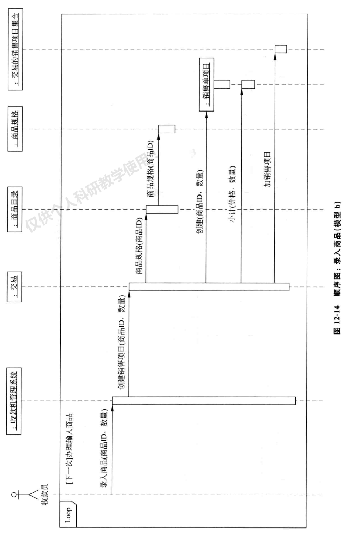 "录入商品”的顺序图模型描述收款员接到客户要买的商品后,开始把这些商品录入到收 款机管理系统 ,管理系统所产生的一系列相应行为。首先,系统根据录入 商品的库存编码(或条形码)到商品目录找到商品的名称和价格等属性;然后,系统在交易 中创建一个针对该商品的销售项目(含有商品名称、型号和价格等信息),并由交易对 象把该销售项目加到销售项目集 合上。收款员按照商品的分类把所有不同的商品录入系统。所以,录入商品 是一个重复性的行为(即循环)。