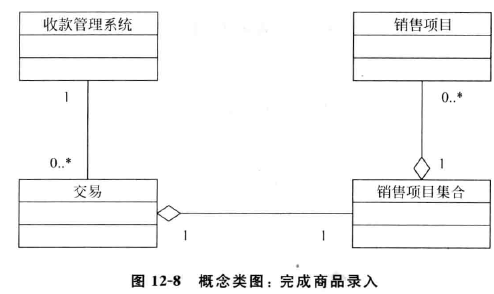 根据“完成商品录入"的顺序图模型(见图 12- 7 ) ,发现图 12-8 概念类图模型中是