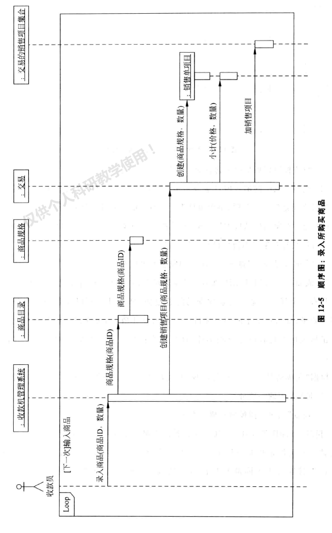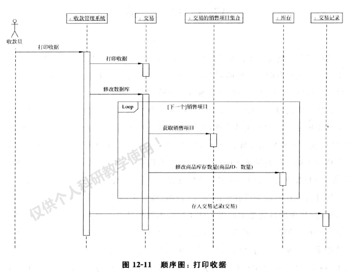 “打印收据“顺序图模型是销售用例中的最后一个环节,客户付款后,收款员操作管理系统的打印功能打印交易收据,打印收据意味着该交易巳经结束,在打印结束前 还需要做几件重要的事情:第 一 ,执行交易对象的打印行为;第 二 ,从销售项目集合中一个一个地获取出销售项目中的商品存货编码和数扯;第 三,从 库 存 中 减去对应商品的数最; 第 四 ,重复第二和第三步骤,直 到 销售项目集合中的所有销售项目都被取出和减库存为止;第 五,管 理 系统对交易作保存记录。