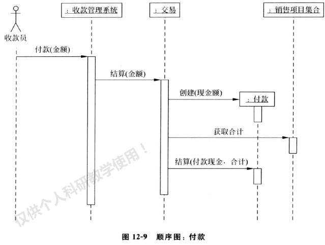 "付款“顺序图模型中,收款员所收到的面额可能大于实际交易金额,另外客户 的付款方式可能是现金或信用卡 ,所以在交易对象中需要一个结算的行为 ,这个行为由千付 款方式不同涉及其他行为的发生,所以,需 要付款对象来完成这些任务。