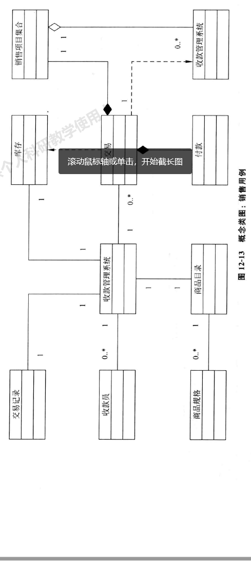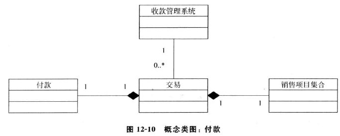 根据“付款"的顺序图模型(见图 12- 9 ) ,建 立图 12-10 概念类图模型。在该模型中,交易对象必须拥有付款对象,所以,交易对象的两个必要组成成分是:销售项目集 合对象和付款对象。