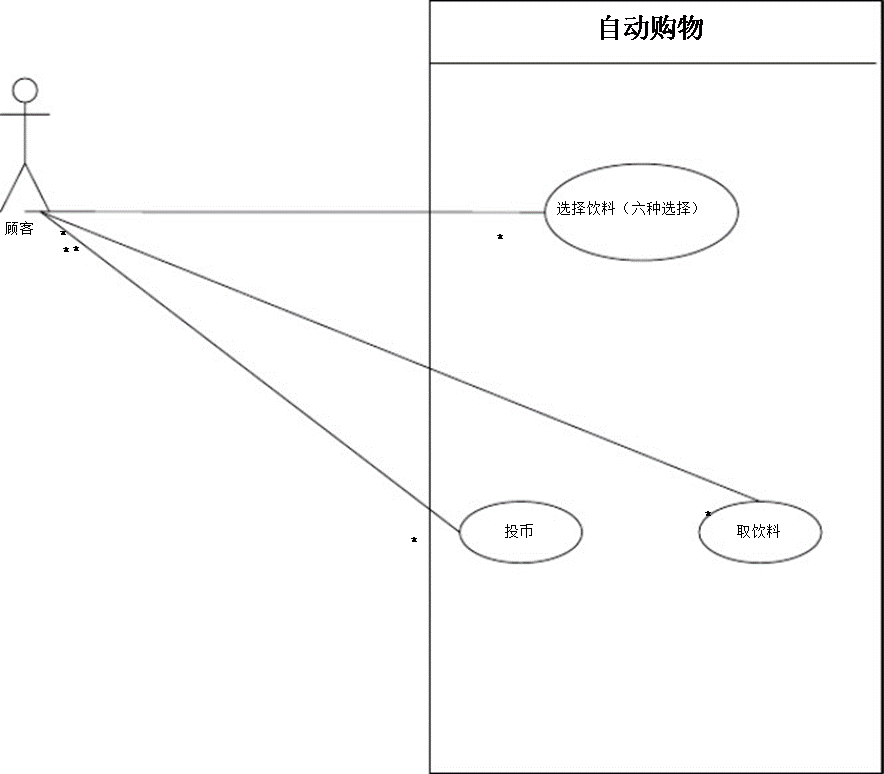 1. 一台自动售货机能提供 6种不同的饮料,售货机上有6个不同的按钮,分别对应这 6 种不同的饮料,顾客通过这些按钮选择不同的饮料。售货机有一个硬币槽和找零槽,分别用来收钱和找钱。现在为这个系统设计一个用例图。