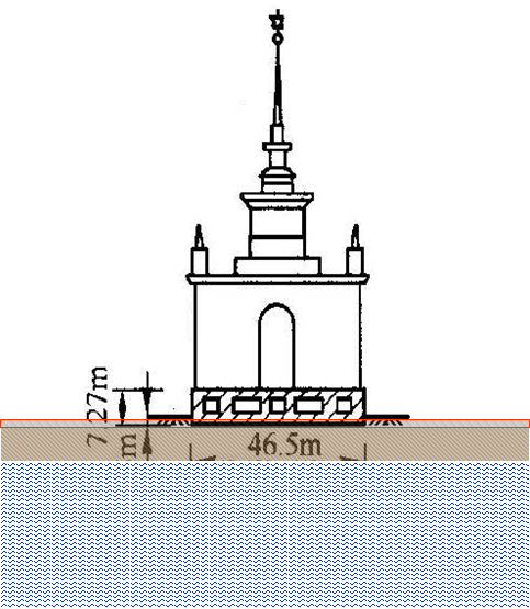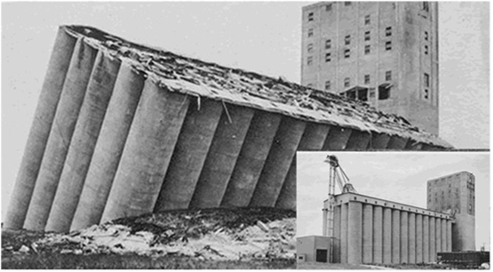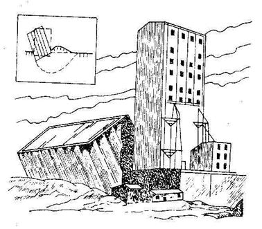 Canada Transcona barn consists of 65 cylindrical silos, which are 31m high. The bottom surface is 59.4m long, under which is 2m thick reinforcedconcrete raft foundation. The selfweight of the barn is 0.2 million kN. When 0.27 millionkN grain was mounted, it was found the barn was obviously unstable, The west of barn was sinking 8.8m in 24hours, the elevation of the eastern end rised 1.5m, the overall tilt is 26o53'.