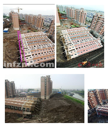 4.5m depth foundation pit was excavated on the south of the building. And the soilwas stacked 10m high up the north side of the building. The weight of stackedsoil generated lateral pressure which was bigger than the resistance of piles.So the building toppled. This accidentwas caused by the wrong process of construction.