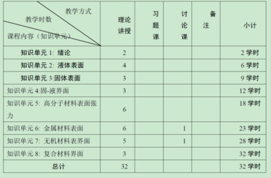 本课程为材料科学与工程专业无机非金属材料方向本科生的选修课。本课程的任务是使学生在学习了液体、固体、液体与固体的表界面,表面化学的基本定理;高分子材料,无机材料、金属材料和复合材料表面与界面等表面与界面的基础物理化学理论、基本概念和知识,掌握材料表面与界面的一般特征和一般规律基础上,进一步了解现代材料表面与界面的主要研究方向和研究方法,了解表面与其内部本体,无论在结构上还是在化学组成上的差别,了解材料改性和材料复合的基本原理;提高学生分析问题,解决问题的能力,为今后从事相关研究和工作打下坚实的基础,并期望对于今后材料学科学习和应用起到积极的引导和启发作用。