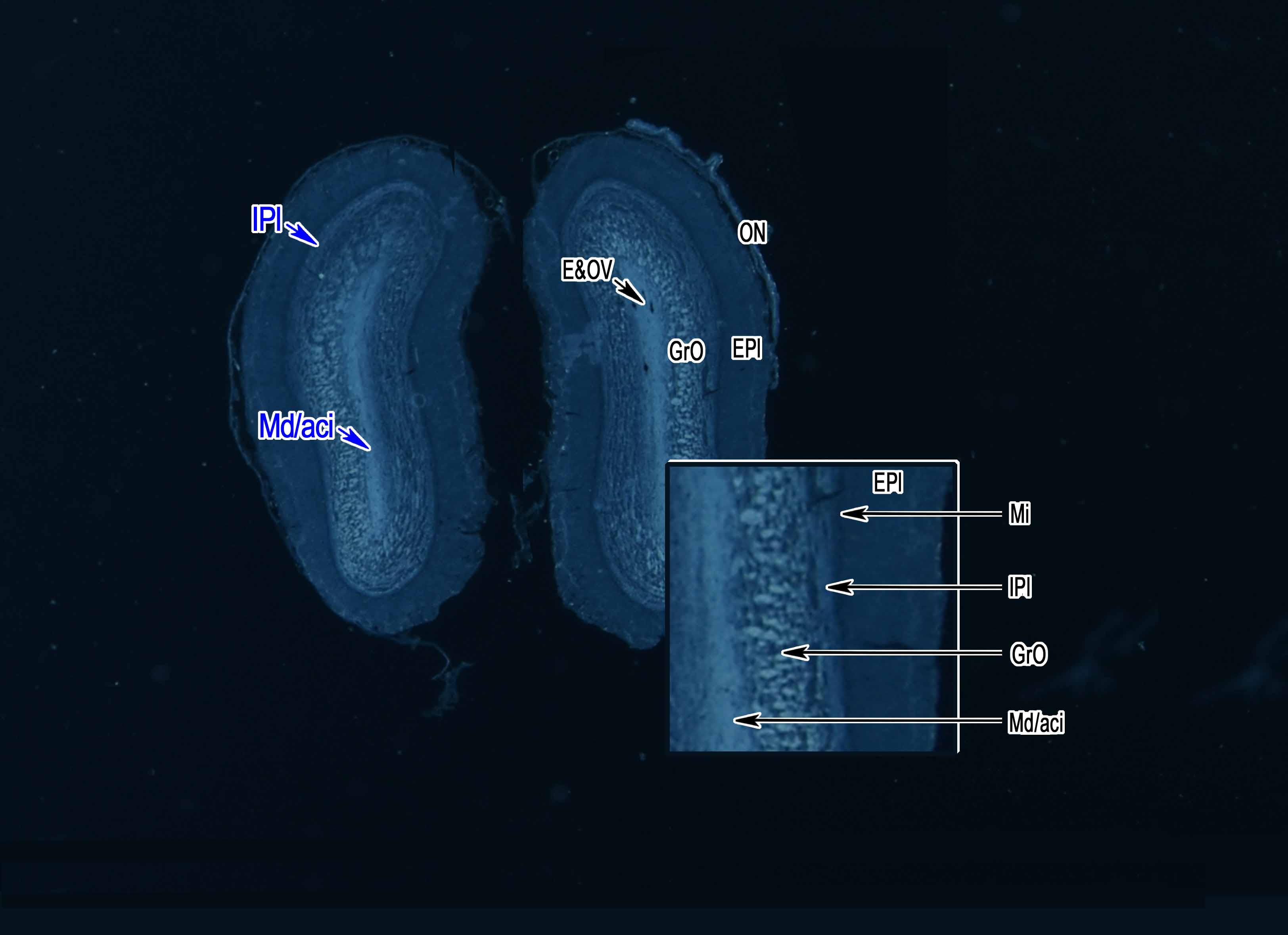 2. 深部位于 EPl深方的僧帽细胞层 Mi为连续的粗线状深染带,高倍镜下见一层密集排列的僧帽细胞,是嗅球内最大的神经元。紧贴 Mi深方的狭窄浅染带为内丛层 IPl,为嗅球层次中最薄者。 IPl深方为嗅球颗粒细胞层 GrO,由丰富的颗粒细胞排成深染的细胞串,环绕 OB中心呈类椭圆形的极性排列。细胞串间的浅染区为纤维束所在,在纤维染色切片内可见丰富的深染纤维束。细胞串向中心部极性逐渐消失,过渡成浅染的嗅球髓层 Md。在 OB中心呈背腹方向的深染细胞索为室管膜层 E,或可见嗅脑室 OV的小腔隙。嗅小球 OGl的空心环状在镜下易于识别,可作为OB结构的特征性辨识标志 。