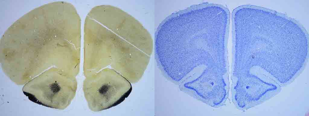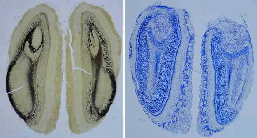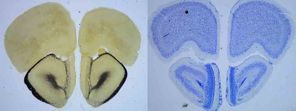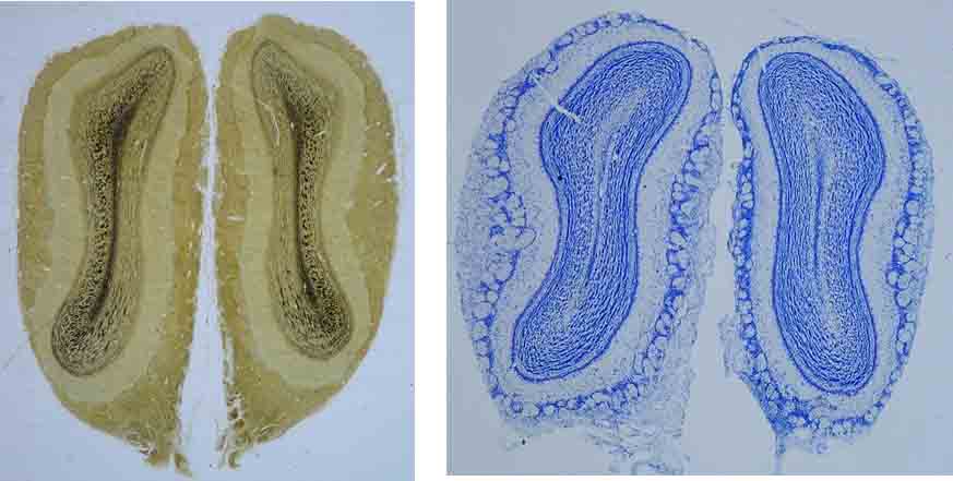 嗅球嗅茎段嗅球中份平面染色(右,Nissl染色,右,Wiegert染色)