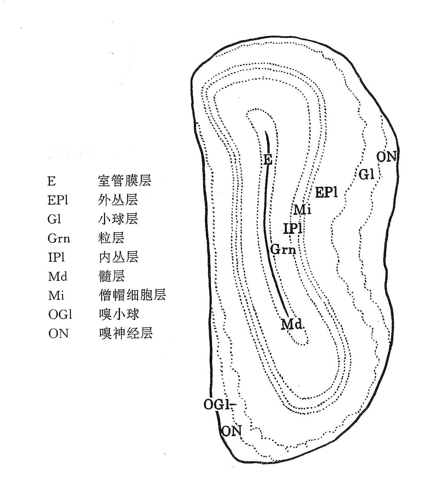 (1)嗅神经层 ON 位于嗅球表面,但背侧面无此层。ON由无髓鞘的嗅神经 on组成, on终止于小球层。