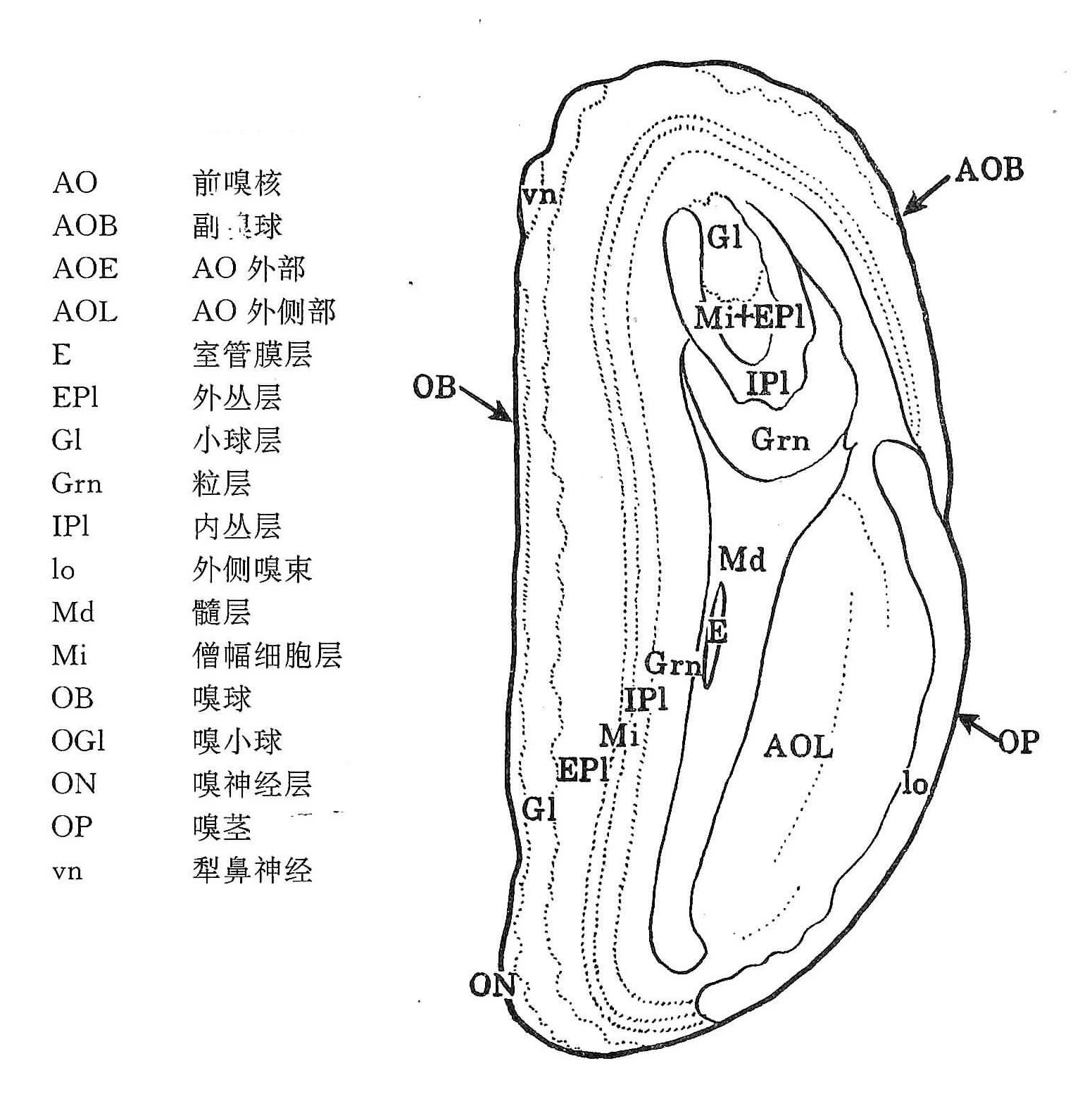 (1)犁鼻神经 vn经由 OB的背内侧连于 AOB的背内侧,为一细小纤维束。与嗅神经on相同,vn也由无髓纤维组成。