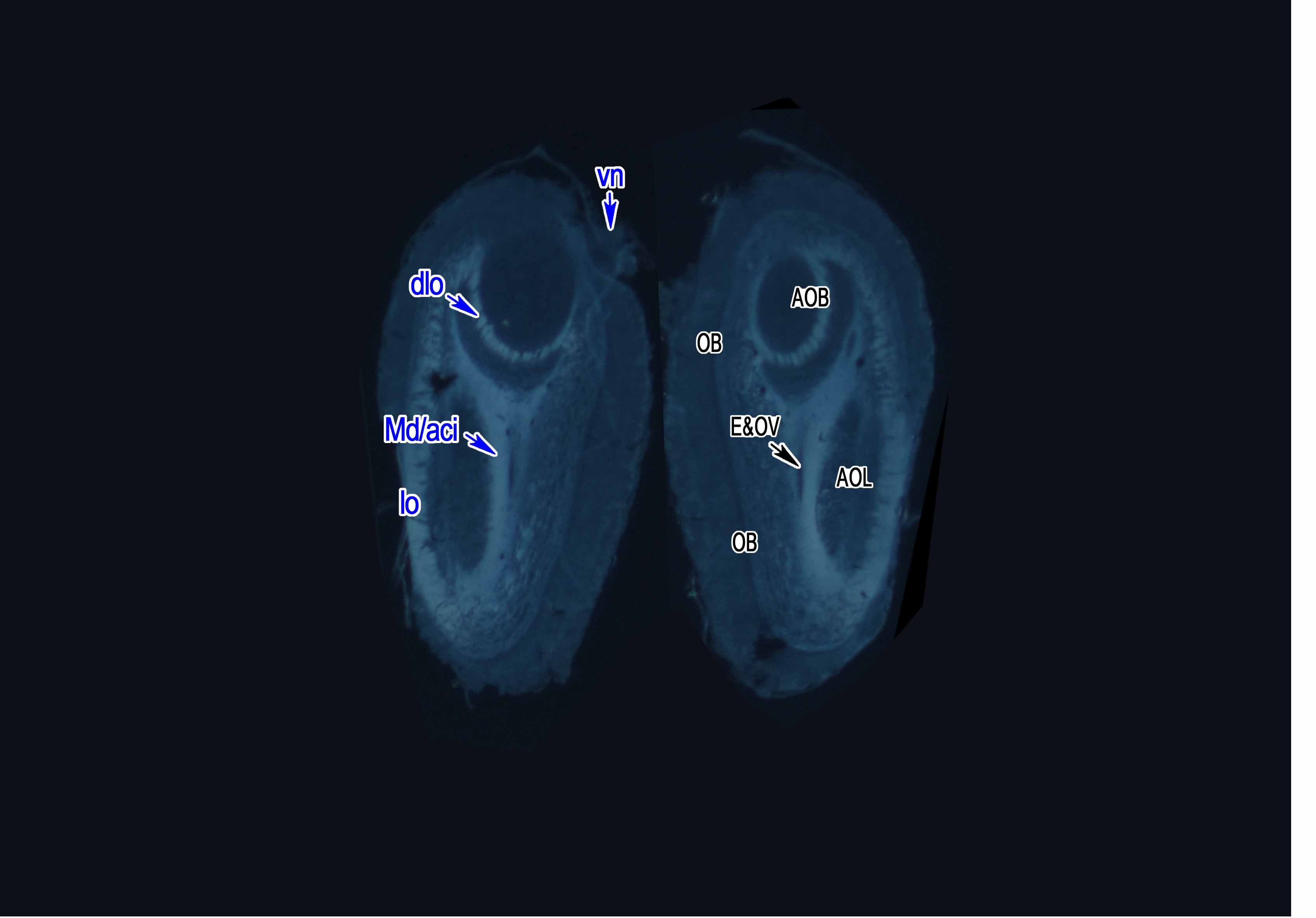 1.嗅球后端结构 OB的 E&OV和 imo/aci穿经此段继续向后伸延,其他层次逐渐消失。嗅茎前份结构主要有前嗅核 AO和外侧嗅束 lo。此切面内可见 AO内侧部 AOM、背侧部 AOD、外侧部AOL和腹侧部 AOV,有时仍见深染的 AO外部 AOE。AOD与 AOL的表面被覆外侧嗅束 lo,位于 AOD背侧者为副嗅球内 dlo的后延。