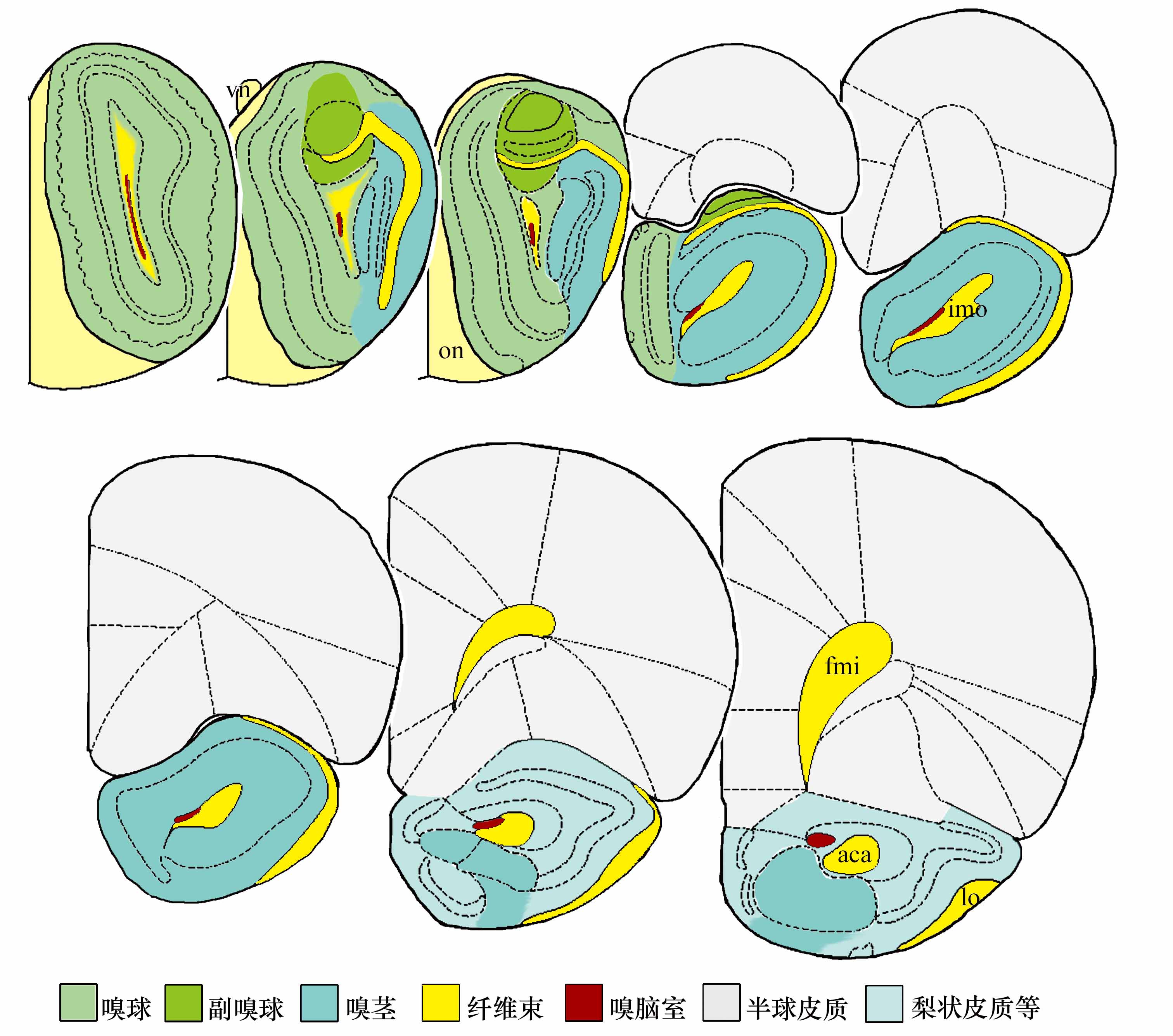 成年大鼠脑本段的嘴尾长度约 4.5 mm,小鼠的约 2.0 mm,被划分为 4个脑区:嗅球、副嗅球、嗅茎和额皮质。选取四张典型切片描述:第一张经嗅球中份,第二张经副嗅球中份,第三张经嗅茎的前份,第四张经嗅茎的后份。