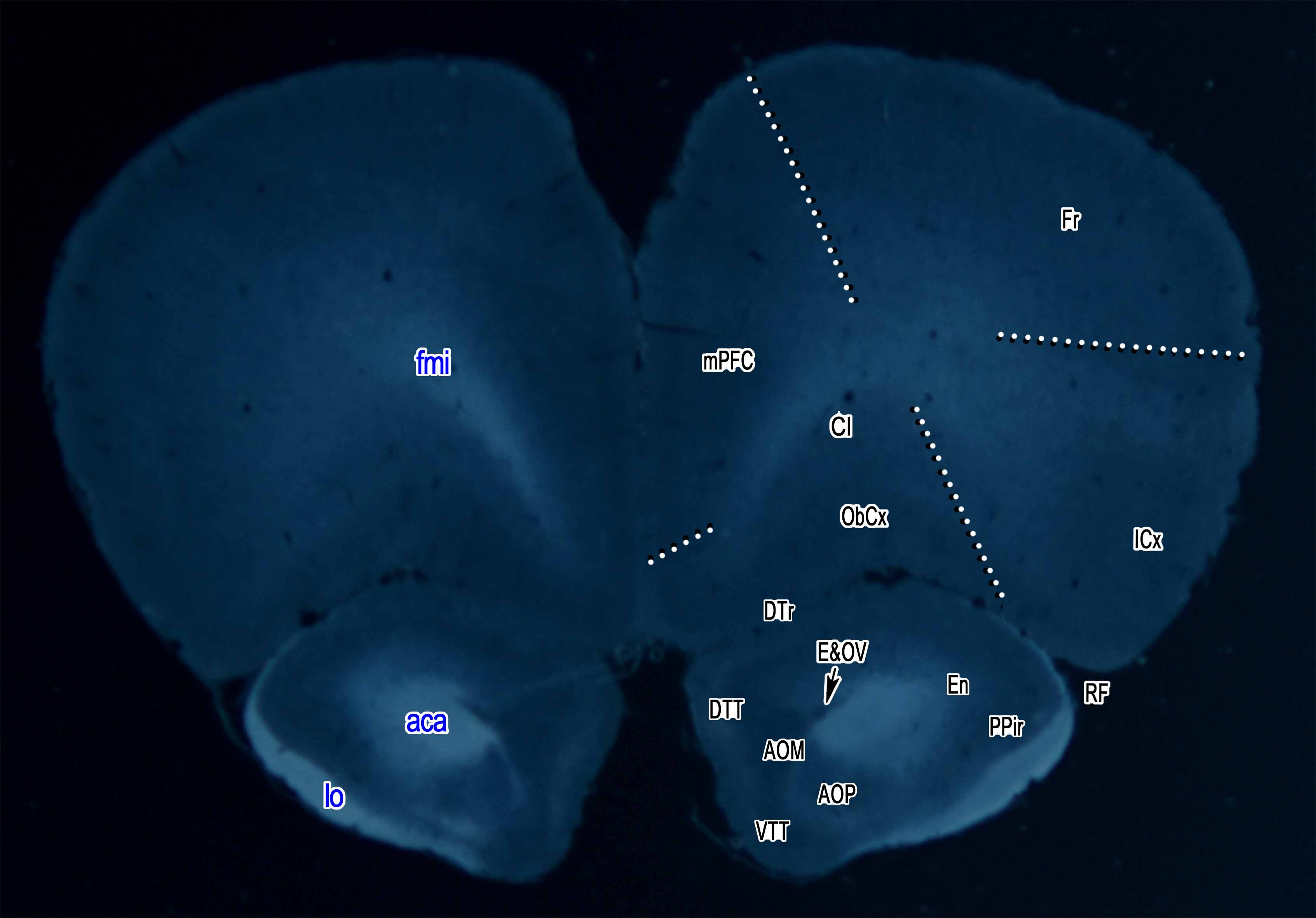 5. 额皮质显著增大,中央部浅染的纤维区称胼胝体小钳 fmi。fmi的内侧为内侧前额皮质 mPFC,背外侧主要为额皮质 Fr,腹侧主要为眶皮质 ObCx,嗅裂 RF/rf的背侧为岛皮质 ICx。ObCx内侧半与嗅茎相连处称背侧移行带 DTr,向后 DTr增宽。