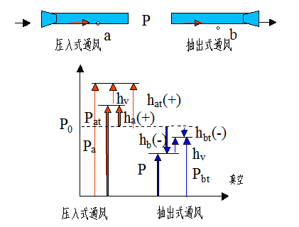 压入式通风的实质是使风机出口风流的能量增加,即出口风流的绝对压力大于风机进口的压力。抽出式通风(负压通风):风流中任一点的相对全压恒为负,对于抽出式通风由于hti和hi为负,实际计算时取其绝对值进行计算。