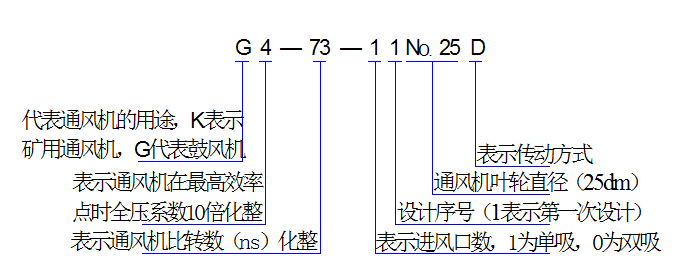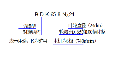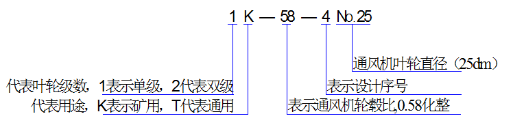 目前我国煤矿在用的轴流式风机有1K58、2K58、GAF和BD或BDK(对旋式)等系列轴流式风机。轴流式风机型号的一般含义是: