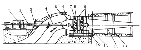 1-电动机;2-联轴器;3-前隔板;4-主轴;5-进风口;6-中隔板;7-叶轮;8-主体风筒;9-整流器;10-后隔板;11-轴承;12-环形扩散器;13-拉筋板