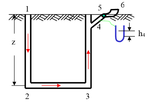 (1)水柱(压差)计示值与矿井通风阻力和风机静压之间关系 水柱计示值:即为 4 断面相对静压,故
