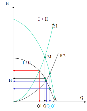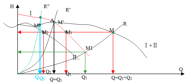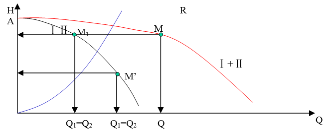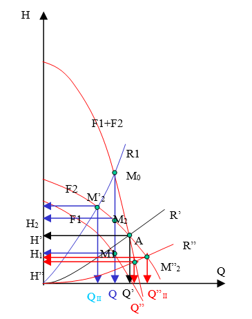 方法:根据上述原则在同一坐标系中将两条风机特性曲线(I,II)合成。