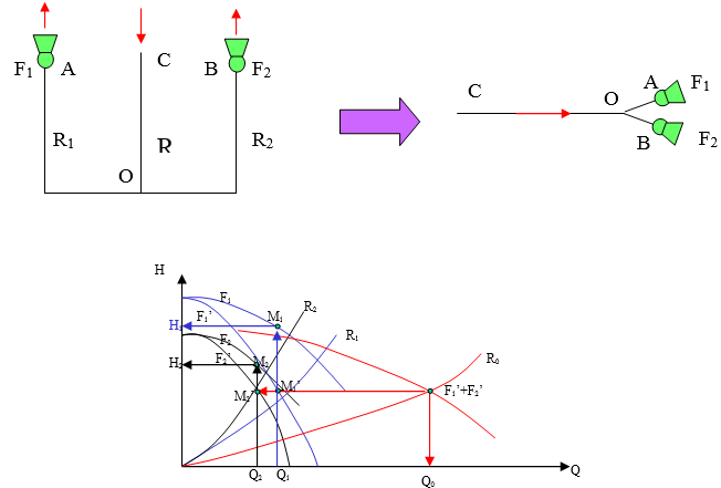 特点:(1)、通过管网的总风量等于每台风机的风量,即
