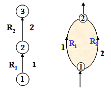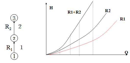 根据以上串联风路的特性,可以绘制串联风路等效阻力特性曲线。方法:1、首先在h—Q坐标图上分别作出串联风路1、2的阻力特性曲R1、R2;