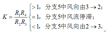 ∴ 改变角联分支两侧的边缘分支的风阻就可以改变角联分支的风向。对图示简单角联风网,可推导出如下角联分支风流方向判别式:
