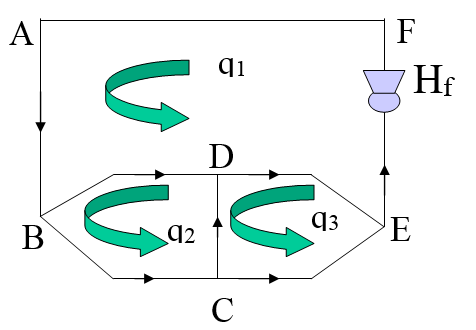 基本思路:初拟风网中各回路风量(如),使其满足风网中节点风量风量平衡定律,然后利用风压平衡定律对其逐一进行修正,从而得各分支假设风量,经把迭代计算修正,各回路风压逐渐趋于平衡,这样各分支风量逐渐接真实值。