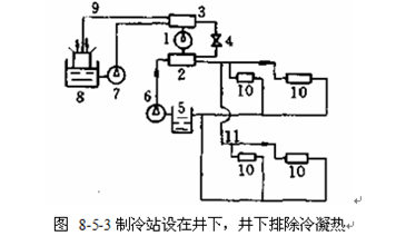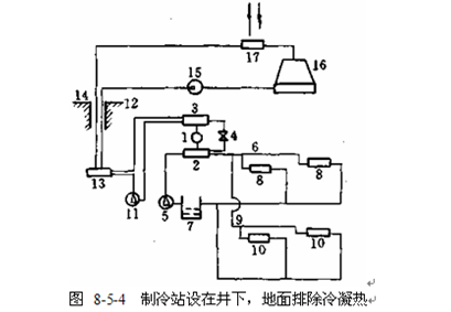 这种布置形式是在地面、井下同时设置制冷站,冷凝热在地面集中排放,如图8-5-5所示。它实际上相当于两级制冷,井下制冷机的冷凝热是借助于地面制冷机冷水系统冷却。