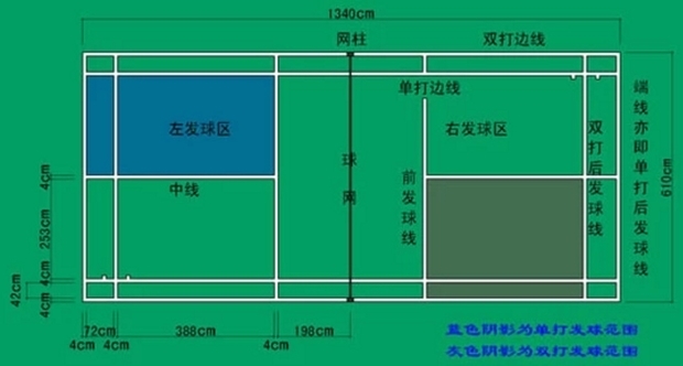 1.羽毛球场呈长方形,各条线宽均为4厘米,场地上空12米以内和四周4米以内不应有障碍物。球场中央网高1.524米,外侧边线处网高1.55米。网柱位于外侧边线上的场地中央处。