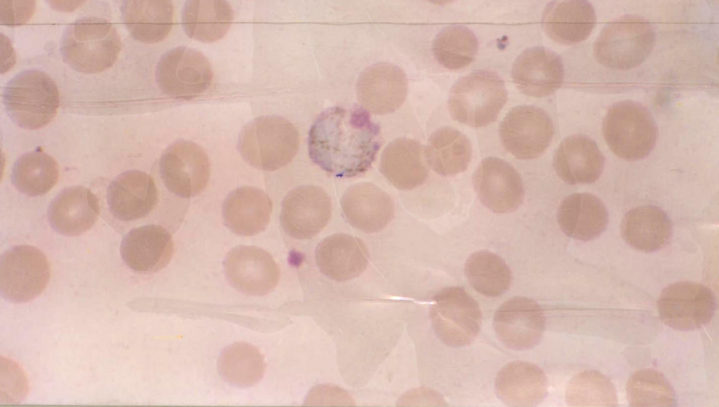 雌配子体:虫体占满胀大的红细胞,常呈圆形,胞质深蓝色;核小,深红色,位于虫体一侧;疟色素多而分散。
