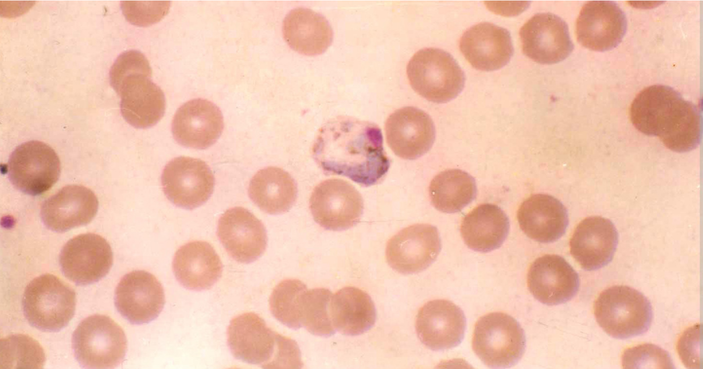 晚期滋养体:胞质增多,形状不规则,可伸出伪足,常含空泡;核1个;疟色素分散在胞质内。
