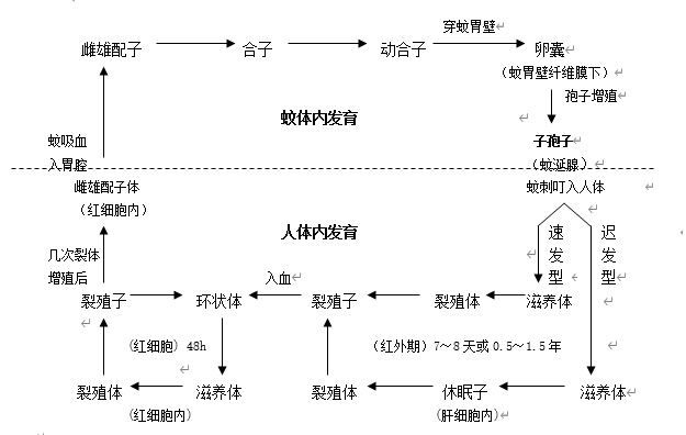 (1)潜伏期:为疟原虫子孢子侵入人体后到出现疟疾发作前,这段时间称潜伏期,包括疟原虫的红细胞外期发育时间和红内期的几次裂体增殖所需时间。间日疟原虫因速发型和迟发型子孢子在肝细胞内发育时间不同,故有短潜伏期和长潜伏期。