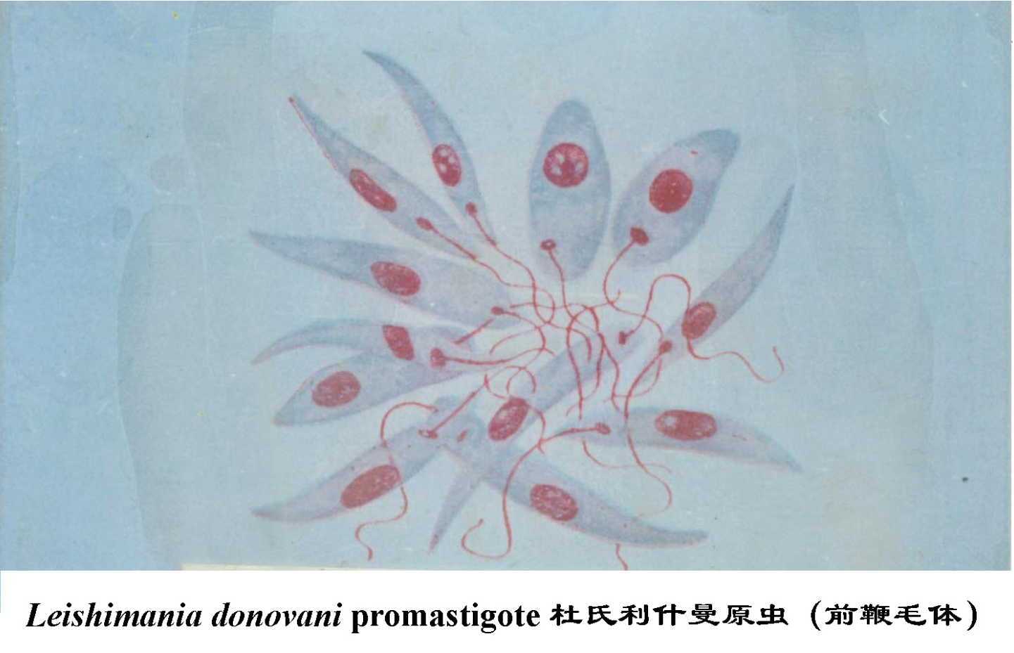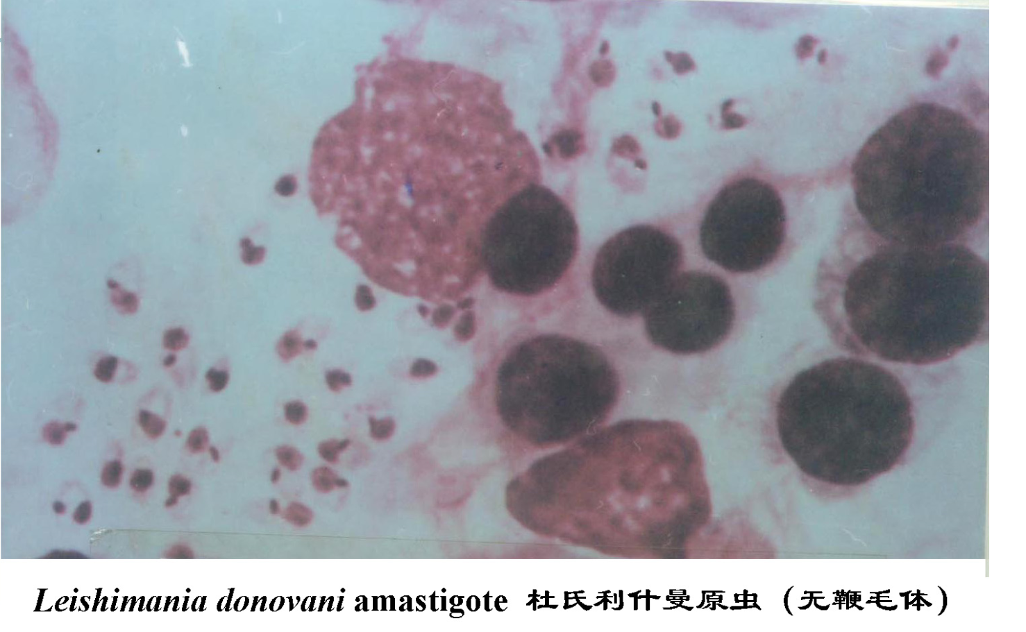 (1)无鞭毛体(亦称利杜体,Leishmania-Donovan body,LD body),圆形,大小为2.9~5.7μm × 1.8 ~ 4.0μm。染色后胞质呈淡兰色或淡红色,细胞核圆形,呈红色或淡紫色。动基体位于核旁,着色深。前端有一基体及由此发出的根丝体。