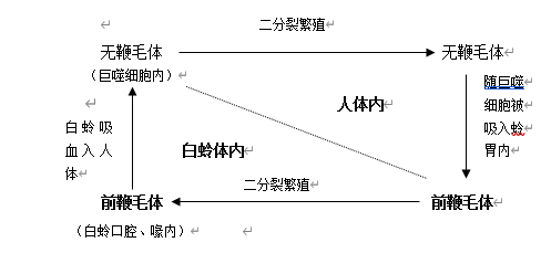 利什曼原虫的生活史包括前鞭毛体(promastigote)和无鞭毛体(amastigote)两个时期。