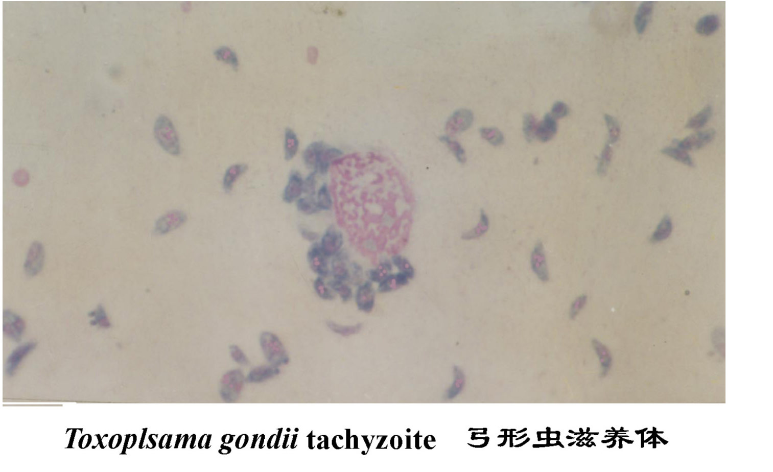 (1)滋养体(又称速殖子) 虫体呈香蕉形或新月形,一端钝圆,一端尖细,大小为4~7μm×2~4μm。经瑞氏或吉氏染色后,细胞质呈蓝色,胞核呈紫红色,位于虫体中央。