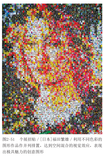 把两种或两种以上的色彩并置在一起,由于我们视觉生理上的限制,经过一定的空间距离,这些色彩会在我们的视网膜上发生混合。色点(线或块)越小,越容易发生混合;离画面越远,也更易发生混合。空间混合中,若各混合色明度差异大,则不易发生混合。