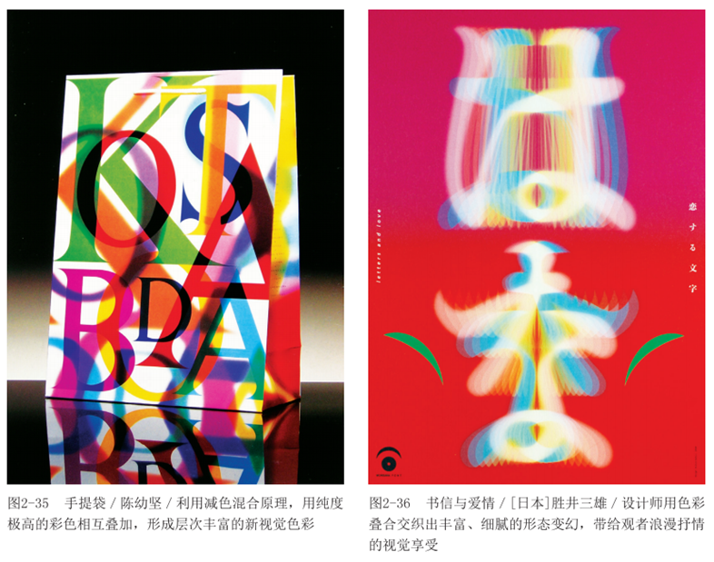 把不同色相的透明物叠置在一起,可以看到具有它们相互特征的新色彩产生。新色彩明度降低,纯度下降,色相为各透叠物色彩的中介,透明物的透明度越低则越偏向叠置在上面的色彩。