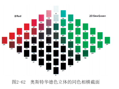 奥斯特华德色立体的纯色都被均匀地排列为环状,各纯色与中轴的距离相等,各种色形的明度、纯度变化规则、整齐,实际上由于各纯色的明度、纯度各不相同,并不能真实地代表色彩关系(见图2-61、图2-62)。