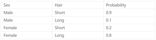 2)男生和女生中有人留长发,有人留短发,因此,性别随机变量与头发长短随机变量(Sex, Hair)的联合概率分布如下表所示,描述了在不同性别中,出现长发(Long)、短发(Short)的概率。