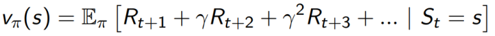 价值函数是对未来奖励的预测,用来评价当前状态的好坏程度。当面对两个不同的状态时,个体可以用一个Value值来评估这两个状态可能获得的最终奖励区别,继而指导选择不同的行为,即制定不同的策略。同时,一个价值函数是基于某一个特定策略的,不同的策略下同一状态的价值并不相同。某一策略下的价值函数可用以下公式进行表示: