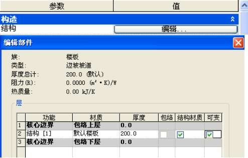 打开类型属性面板,新创建楼板类型为“边坡坡道”,设置其结构厚度为 200mm,。单